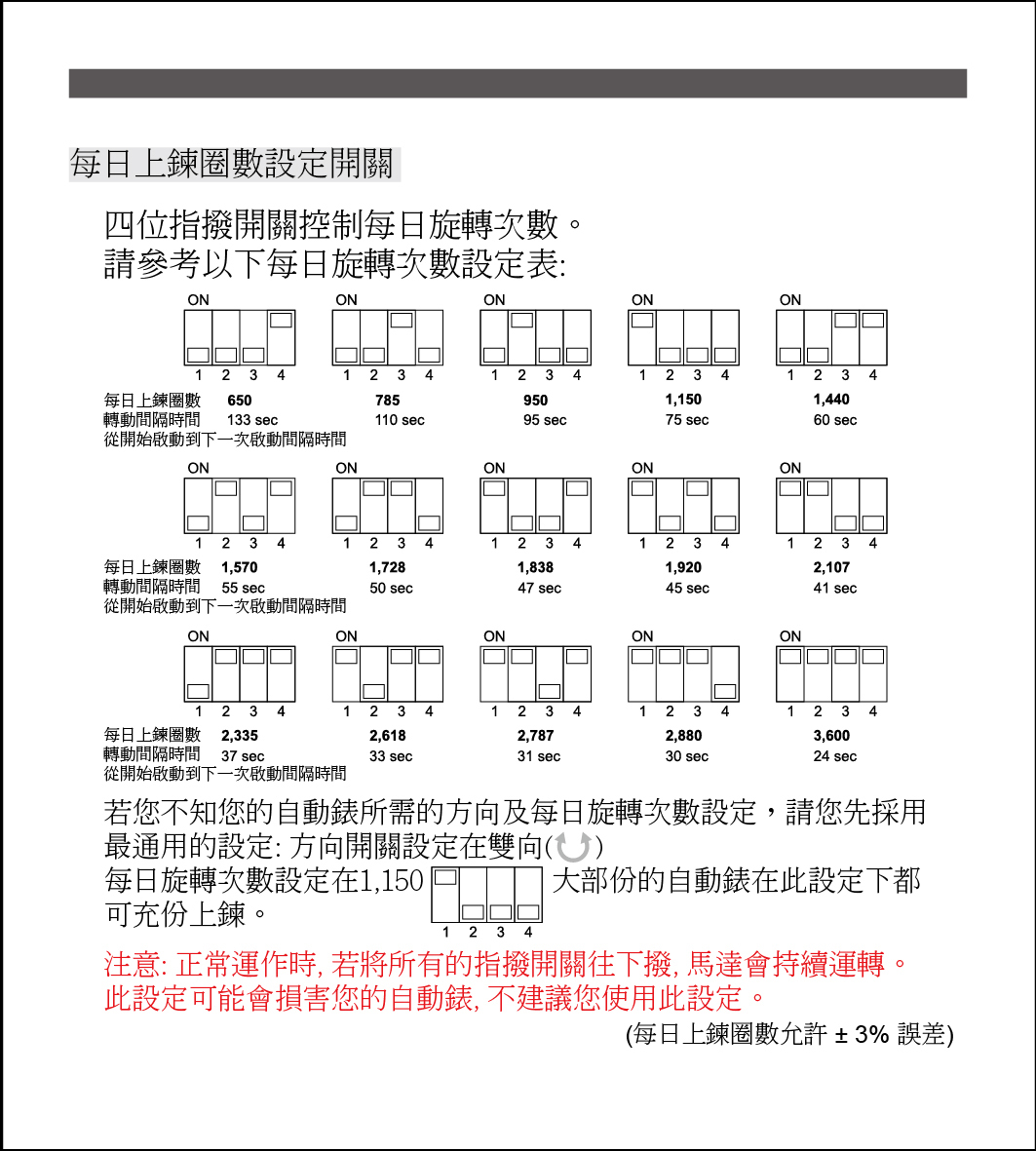 若您不知道自己的錶所需的上鍊方向及每日上鍊圈數設定,請您採用"順時針、1150圈 (或 1248-BRICK/1250-BLDC B) 大部分手錶在此設定下皆可充分上鍊。